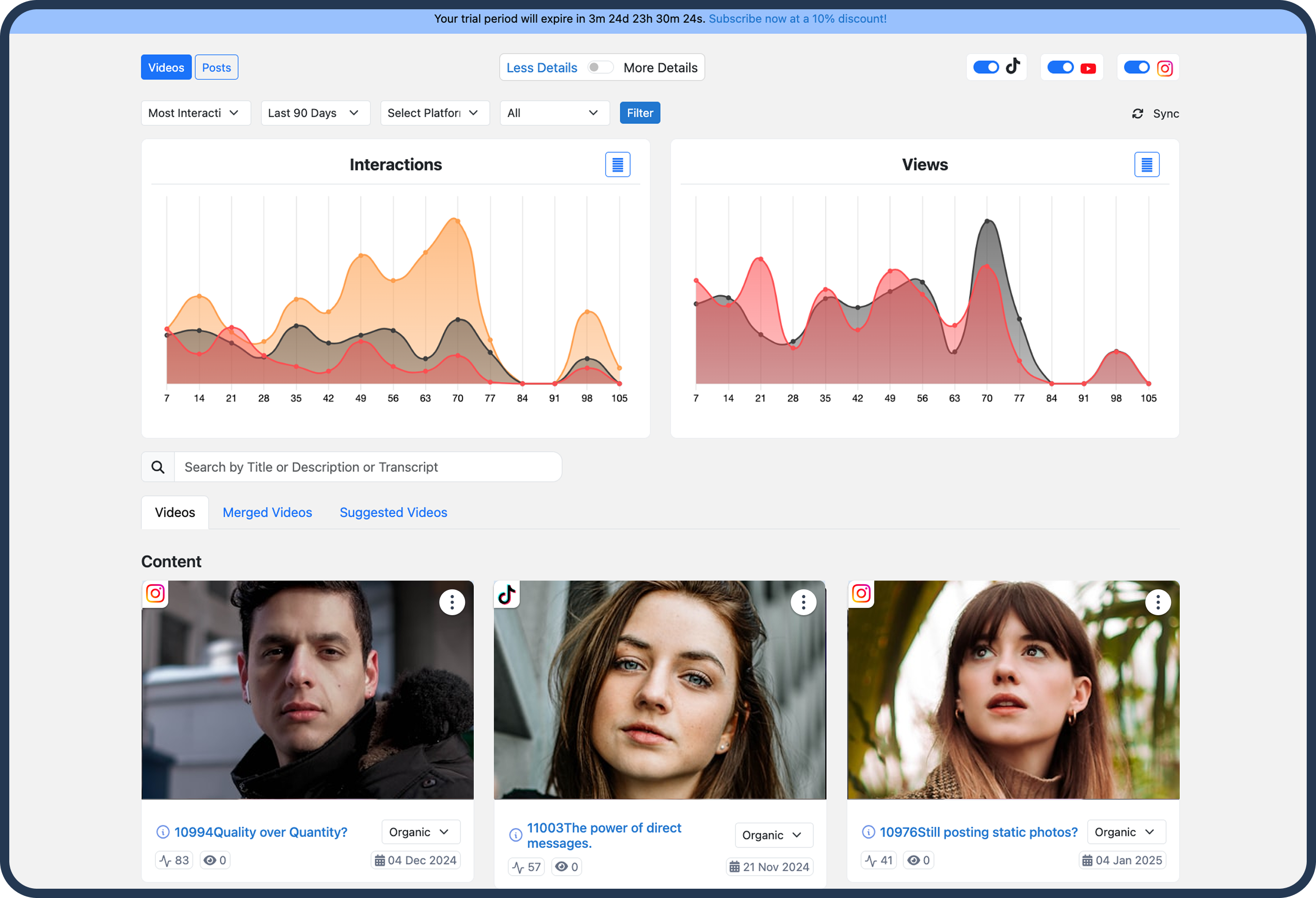 Just link your socials (YouTube, Instagram, TikTok, Facebook, LinkedIn, X) and Attnhub starts analyzing everything instantly.Finally... One place to view all your content. No more jumping between tabs or logging into multiple platforms.